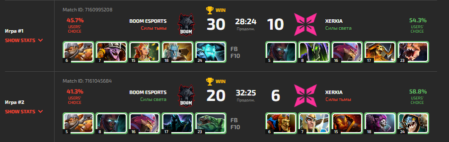 Уже со старта первой карты команда BOOM смогла захватить инициативу. Благодаря активной игре Yopaj на Storm Spirit им удавалось делать убийства на каждой линии. После очередной проигранной драки Xerxia приняли решение сдаться.