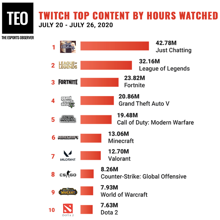 Аналитики портала Esports Observer как обычно опубликовали ТОП-10 категорий на Twitch за прошлую неделю. Популярность основывалась на количестве просмотренных часов каждой из них.
