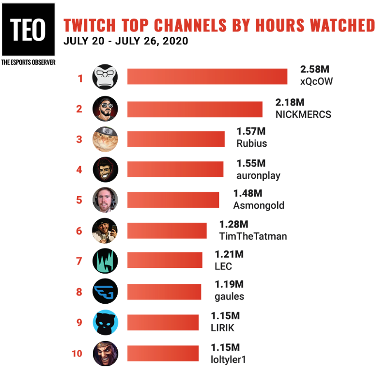 Помимо категорий, был также опубликован список самых просматриваемых каналов на Twitch за то же время.