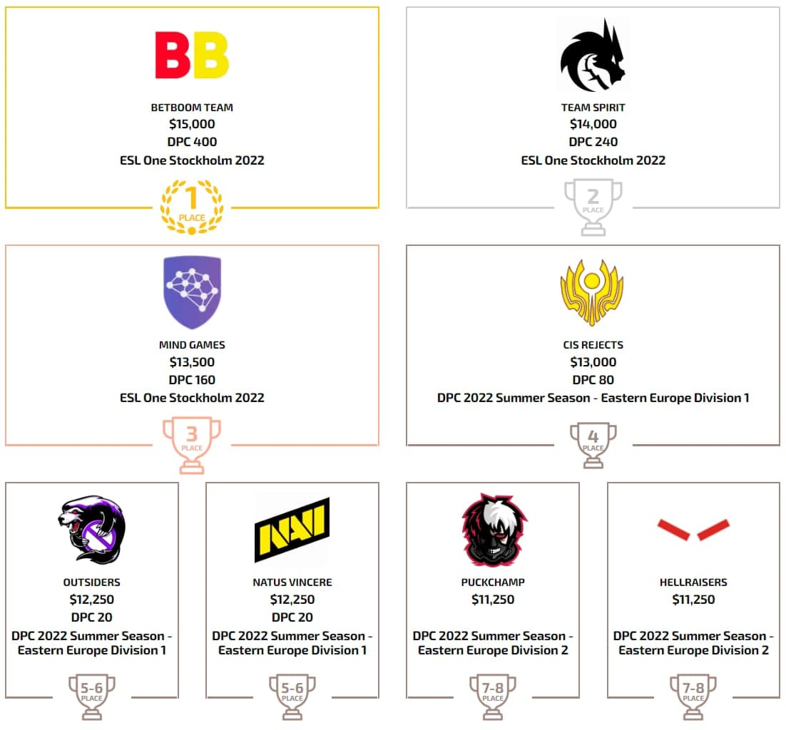 DPC EEU: Playoffs was held online from April 27 to May 2. The tournament featured 8 teams fighting against each other for a total prize pool of $102,500, 920 DPC points and 3 invitations to the ESL One Stockholm Dota Major 2022.