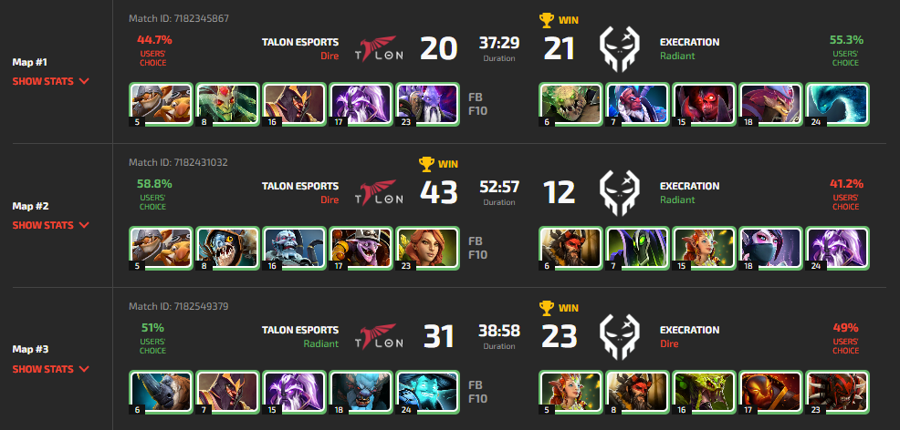 В начальной стадии драфта на первой карте Talon сразу же забрали сигнатурную Medusa для Ньенгнара '23savage' Тирамаханона, Execration ответили Morphling для Джинн Марри 'Palos' П.Ламатао, а к нему добрали Pangolier и Shadow Demon, еще двух героев против которых Medusa плохо себя чувствует, что впоследствии и привело к поражению. У Medusa возникли проблемы уже со стадии лайнинга, а команда, без импакта от своего керри вытащить карту не смогла.