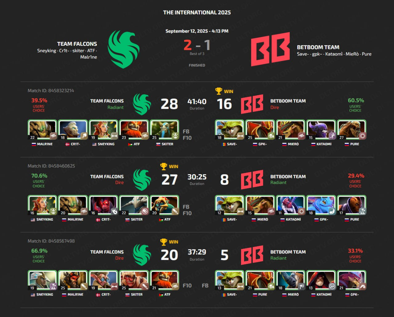 No final do dia, Team Falcons venceu BetBoom Team. No primeiro mapa, Team Falcons tinha uma grande vantagem, mas não conseguiram terminar o jogo. Os cores da BetBoom Team chegaram ao late, onde eram muito mais fortes. Os heróis de Team Falcons explodiram na teamfight. No segundo e terceiro mapas, BetBoom Team se perdeu na fase de drafts. Pure jogou de Antimage com KDA 0/7/3 e de Dragon Knight com 0/7/1. Team Falcons, por sua vez, fez tudo perfeitamente. Vale a pena notar que neste dia skiter comemorou seu aniversário, ele completou 27 anos.