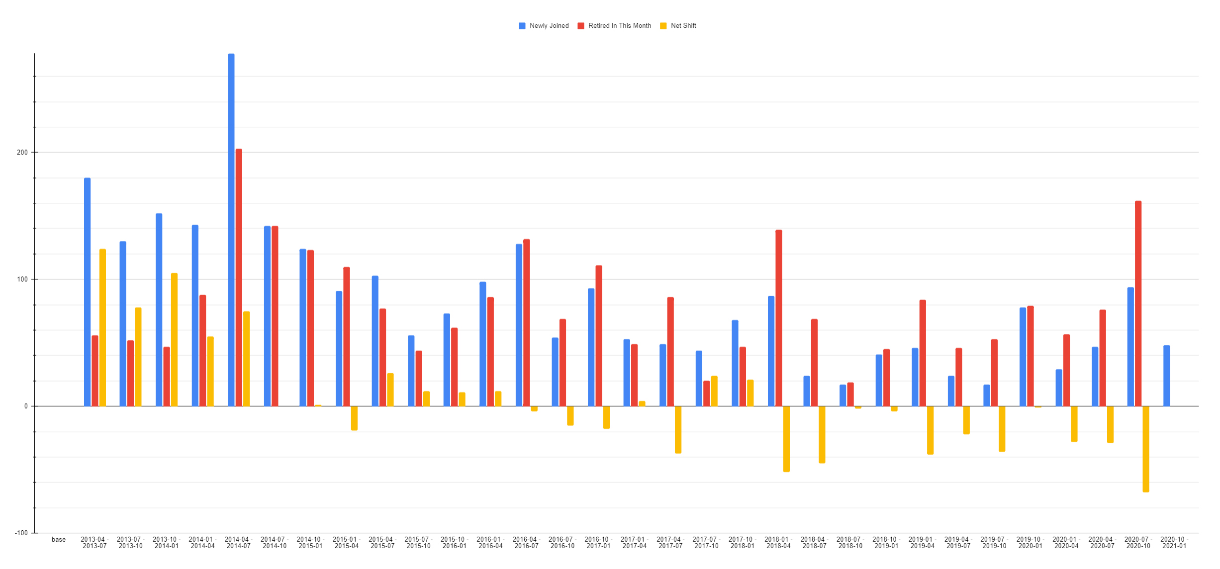 The chart starts in 2013 and is broken down by quarters. Blue represents the number of new players, red represents the number of players who left the scene, and yellow represents their difference.