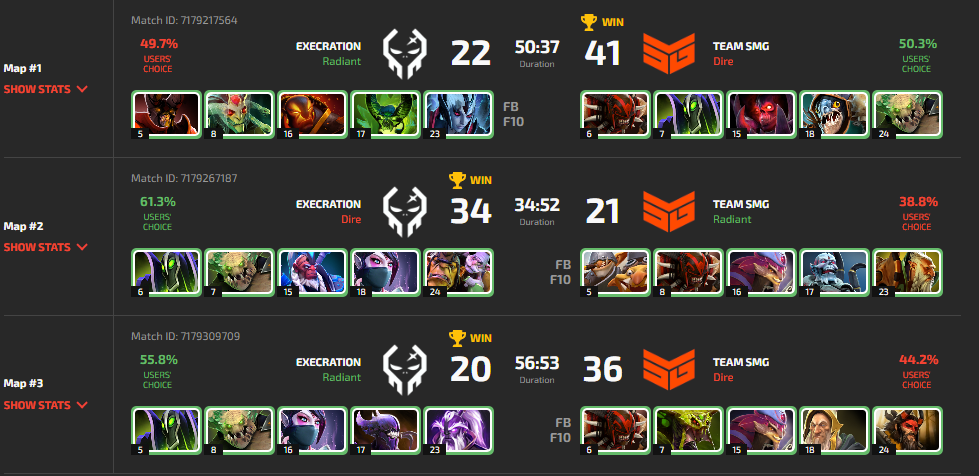 На первой карте Execration удалось захватить преимущество в 5,000 золота за счет одиночных убийств. Но SMG хватило одной удачной драки, чтобы отыграться и снести одну сторону. На 35 минуте SMG снова поднялись на хайграунд противника, но даже с аегисом файт для них был проигран и Execration смогли разменяться 4 в 2, а перевес в 10,000 золота скатился в ноль. На 40 минуте игры снова произошёл тим-файт, который SMG смогли выиграть за счёт байбеков. После такого провала, игра для Execration была окончена.