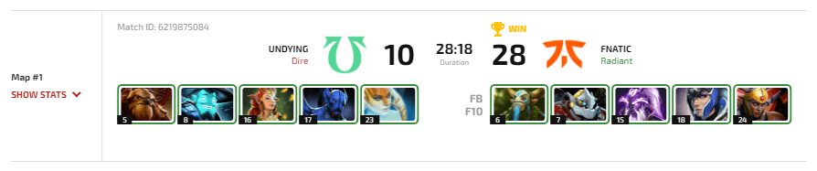 После двух матчей верхней сетки стартовали матчи на вылет, и в первом из них встретились Fnatic и Undying. До его старта предсказания склонялись в сторону Undying: 59.1% против 40.9% за Fnatic.
