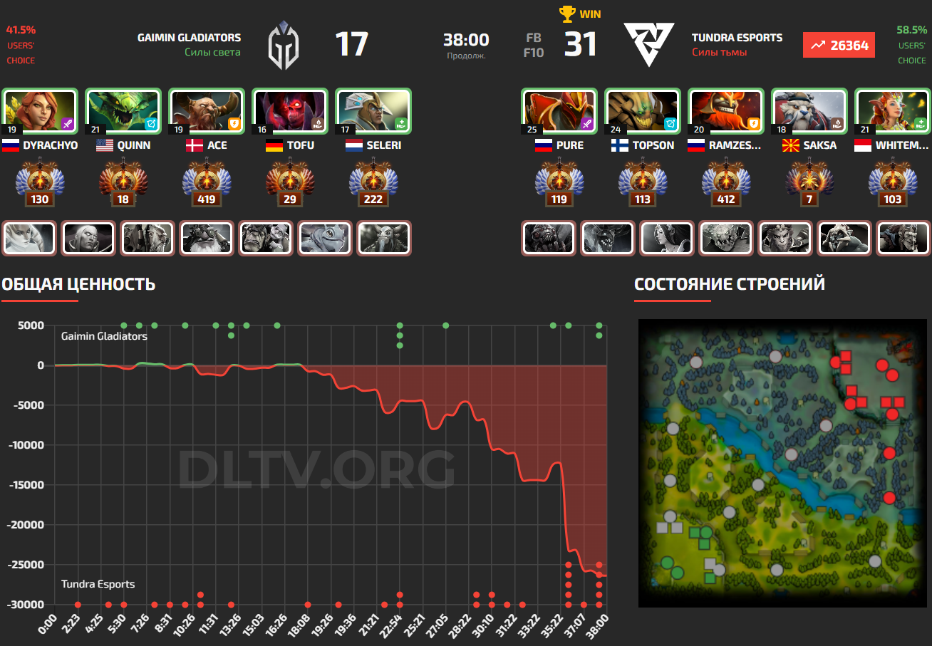 На первой карте Gaimin Gladiators взяли более сильный драфт, Quinn на Viper стоял против Topson на Sand King. У Topson все было настолько плохо, что ему пришлось уйти в лес. Игра бы закончилась через 20 минут, если бы не гениальный мув от Whitemon на Enchantres. Прирученным кентавром, он застанил Quinn под башней, не дав ему убить Topson, разбил руну воды, вывел крипов под вторую руну, где все вместе с Sand King убил Viper. Благодоря этому Topson полностью камбекнул в игру, он начал бегать по лайнам и вместе с союзниками ловить врагов. Tundra Esports разогнались и забрали карту себе в копилку. Стоит отметить игру Pure на Dragon Knight, его статистика - 9/1/12.