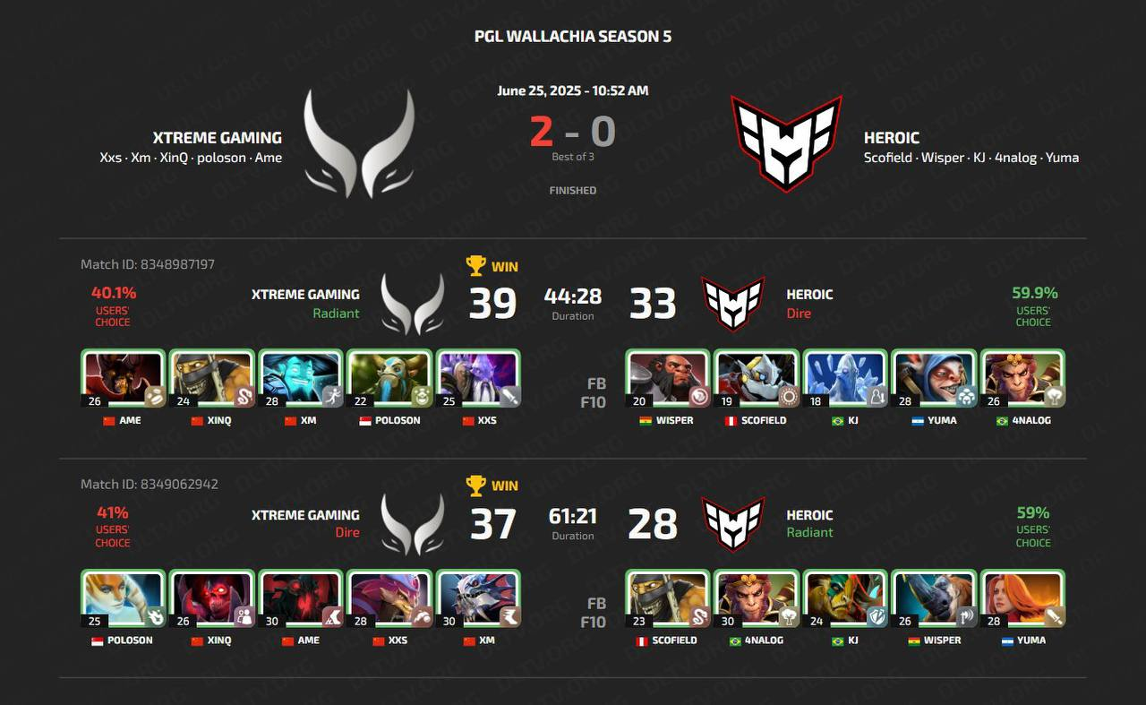 Xtreme Gaming teve controle firme de ambos os jogos da série, exceto por alguns pequenos contratempos no segundo. Heroic tentou uma reviravolta após estar em desvantagem contra Mega Creeps, mas, no final, a vantagem da equipe chinesa era muito grande.