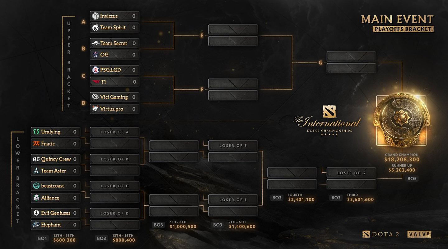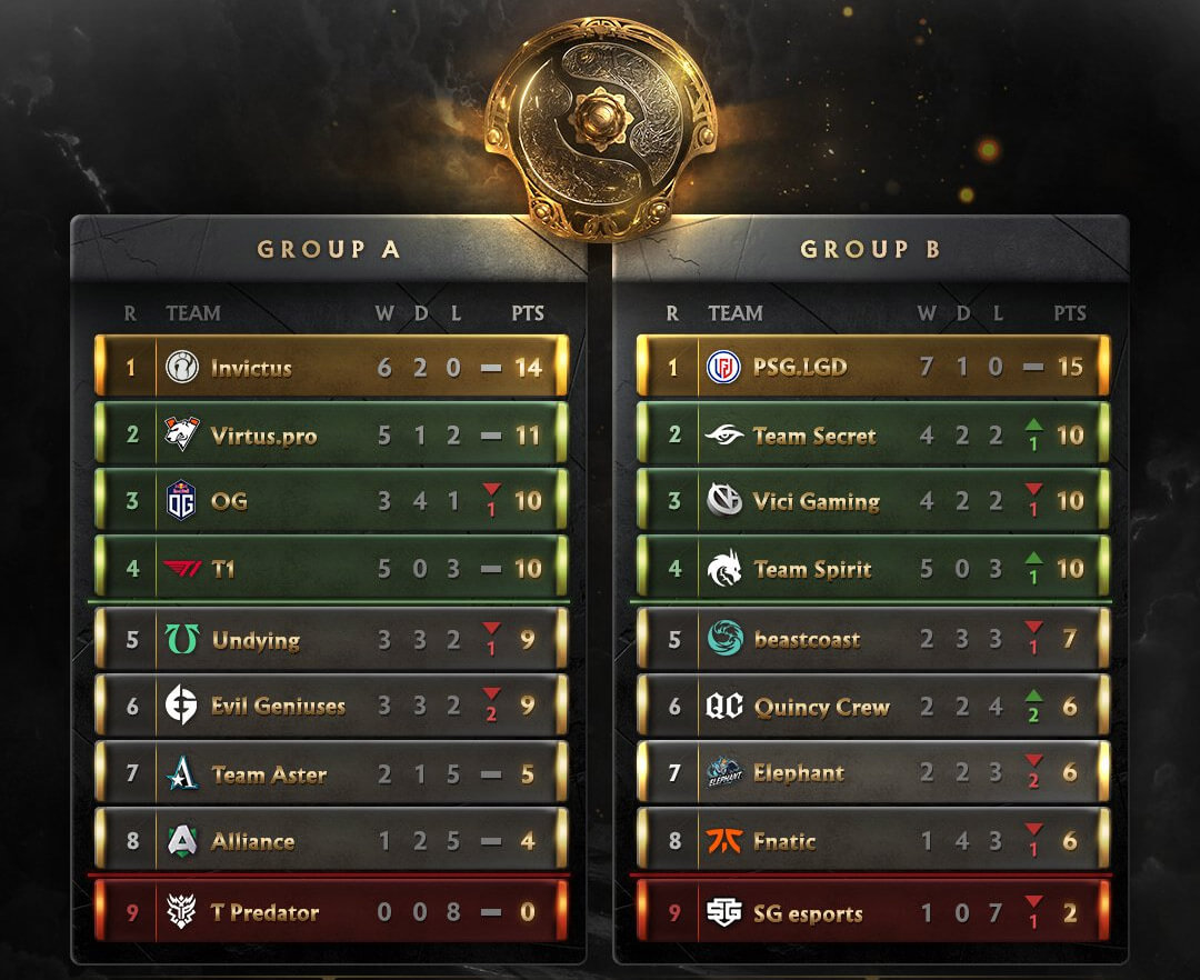 Immediately after the end of the group stage, a playoff draw was held. Thus, the top teams in the groups, PSG.LGD and Invictus Gaming, chose their opponent among the 3rd and 4th places. There was a similar distribution at the bottom, with the 5th place teams choosing their opponent among the 7th and 8th places.