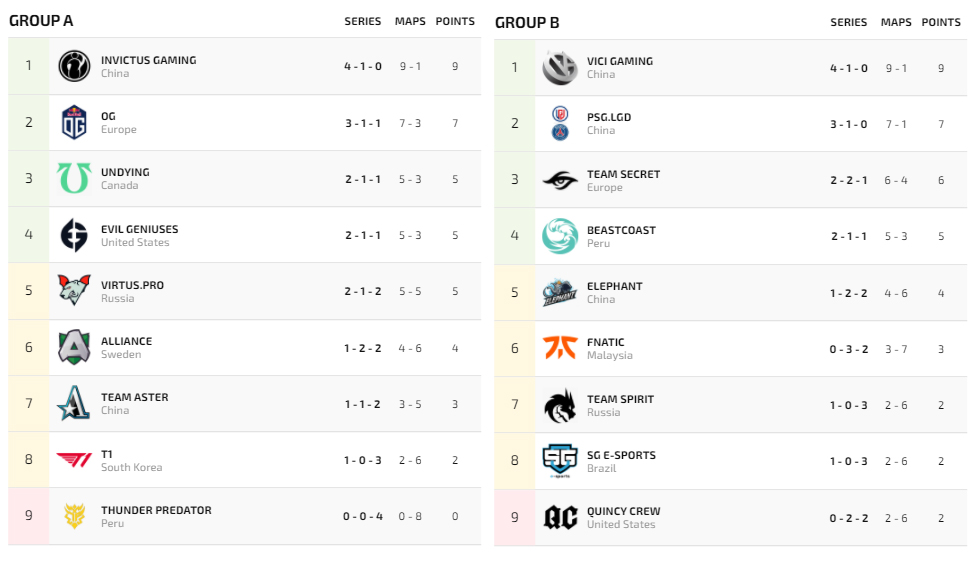 There is a new leader in Group A. After the second day, Invictus Gaming has 4 wins and 1 draw that equals 9 points. Next comes OG, who lost the series to Team Aster. Then, there are 3 teams with 5 points: Team Undying, Evil Geniuses, and Virtus Pro.