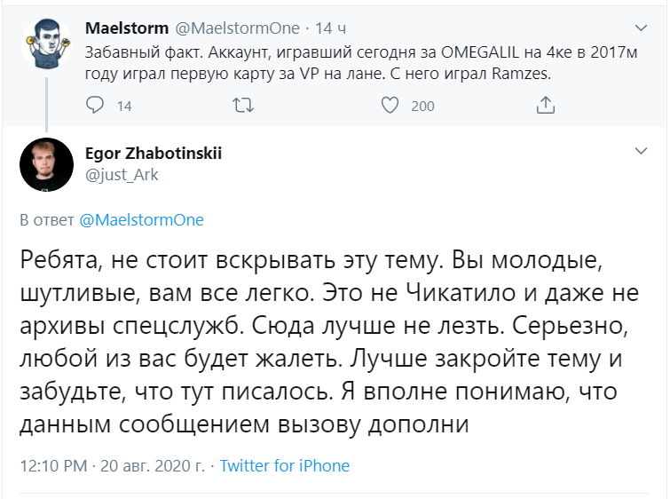 Translate the ark's tweet: Guys, you shouldn't talk about such a topic. You're young, joking, everything is easy for you. That is not Chikatilo and even special services archives. You'd stay out of this. Seriously, every one of you will regret it. Better close the topic and forget what was written here. I fully understand that I'll create more questions by my actions